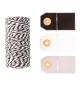 O conjunto inclui um rolo de 100 m de fio de algodão preto e branco e 30 etiquetas para pendurar em diferentes cores: preto, branco e cinzento.