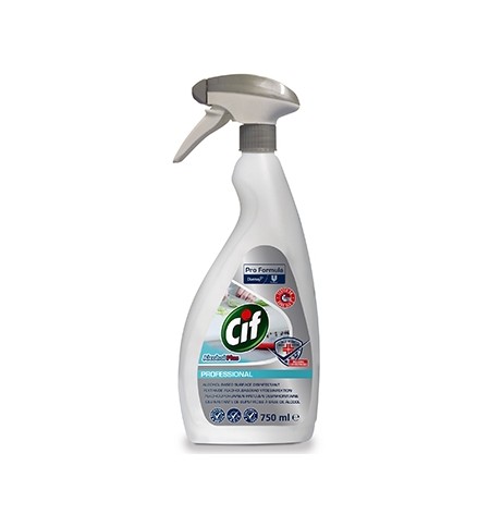 Cif Pro Formula Alcohol plus é um desinfetante pronto a usar à base de álcool para utilização em ambientes de cozinha ou áreas alimentares. Pode ser usado regularmente para desinfetar qualquer superfície dura durante o dia e é seguro para utilização em zonas com alimentos, uma vez que evapora e não deixa resíduos.